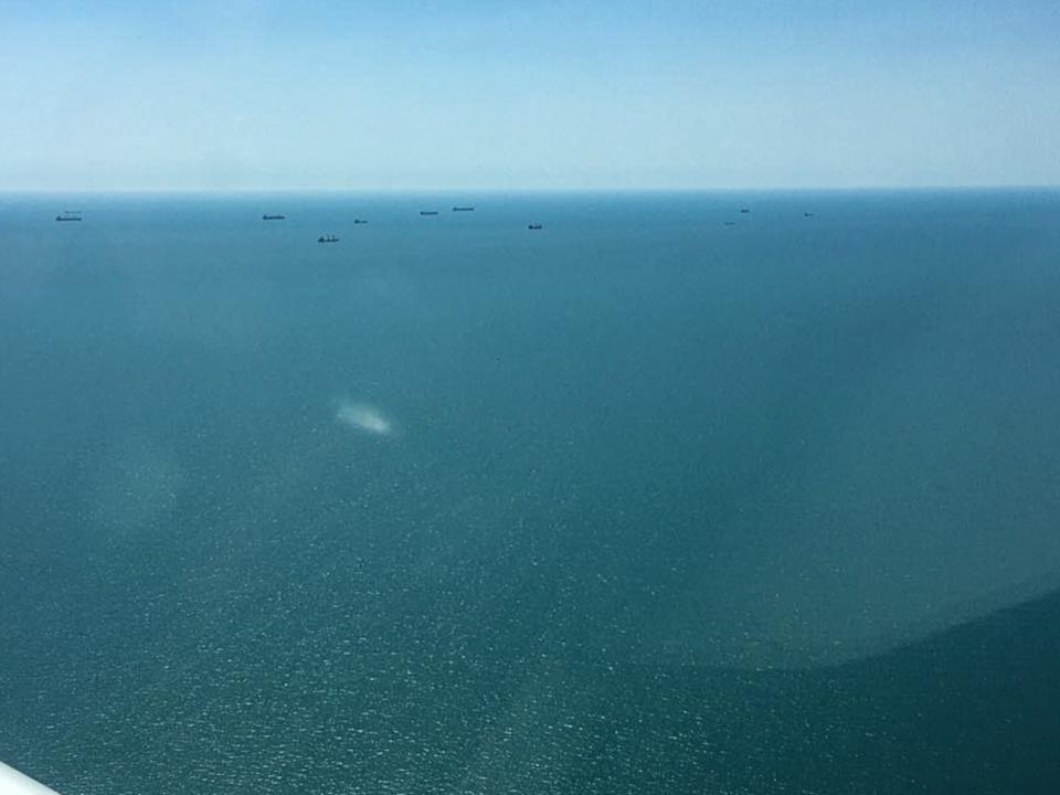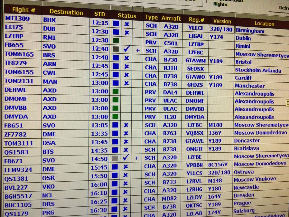 Burgas schickt uns zum Empfang zunächst einmal in 600 ft über Wasser ins Holding und lässt uns da 10 Minuten warten. Anschließend muss jeder Pilot seine Maschine einzeln im Abstand von 2 Minuten auf die Piste bringen. (wahrscheinlich wegen unserer starken Wirbelschleppen ;-))