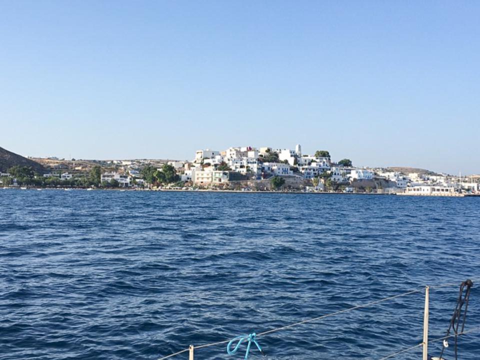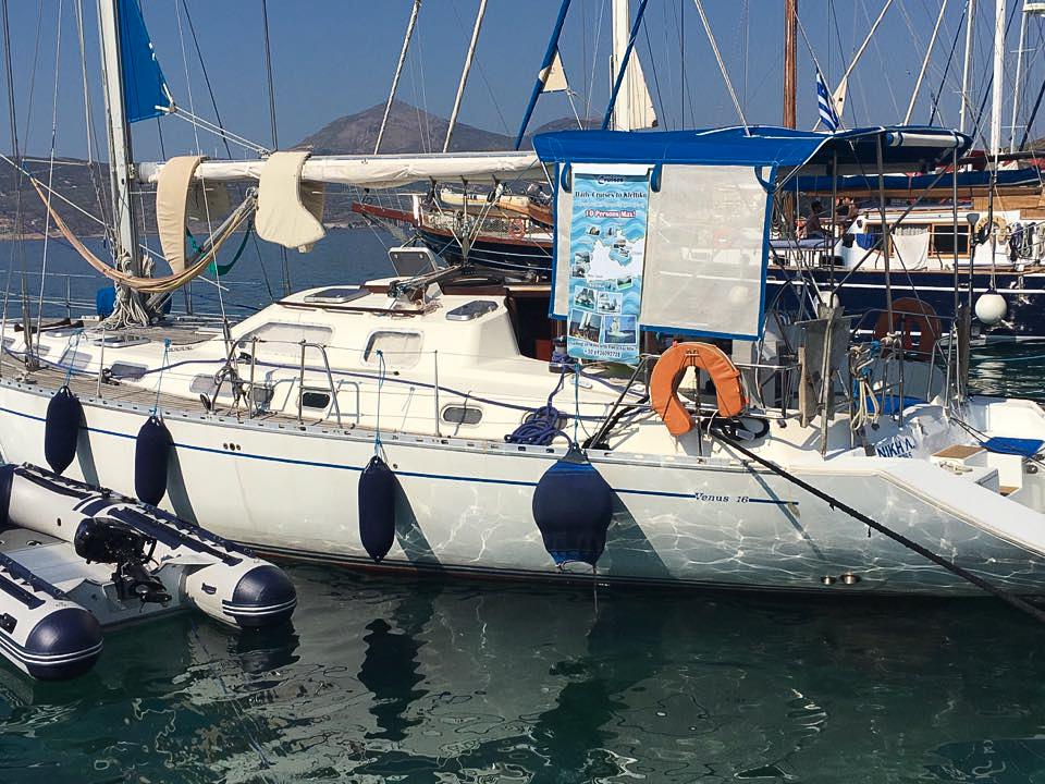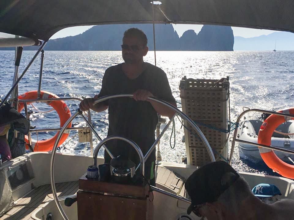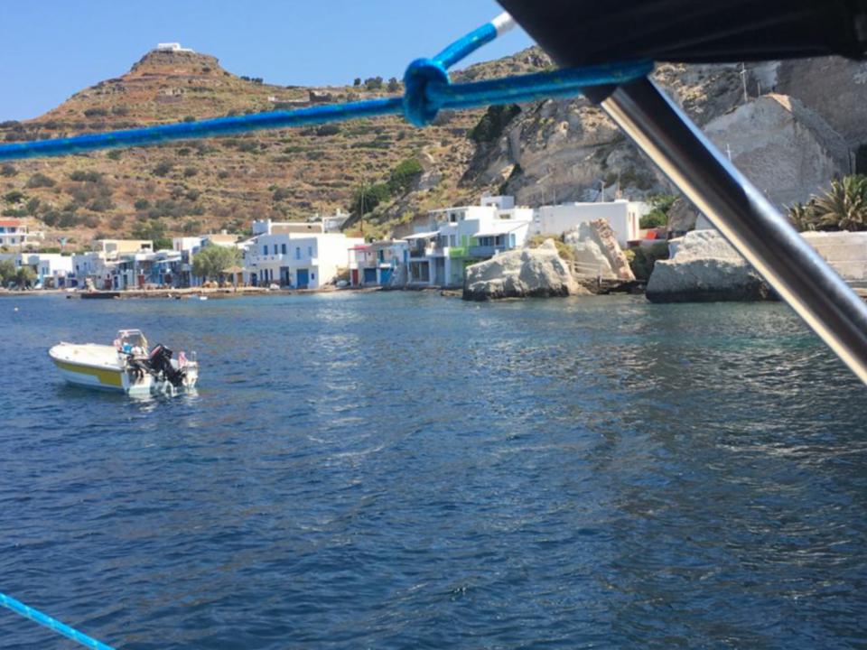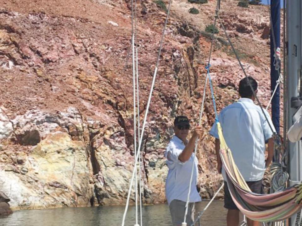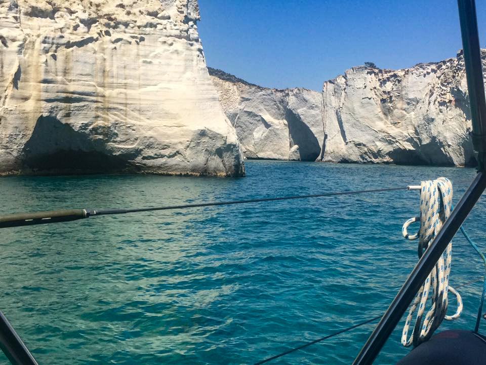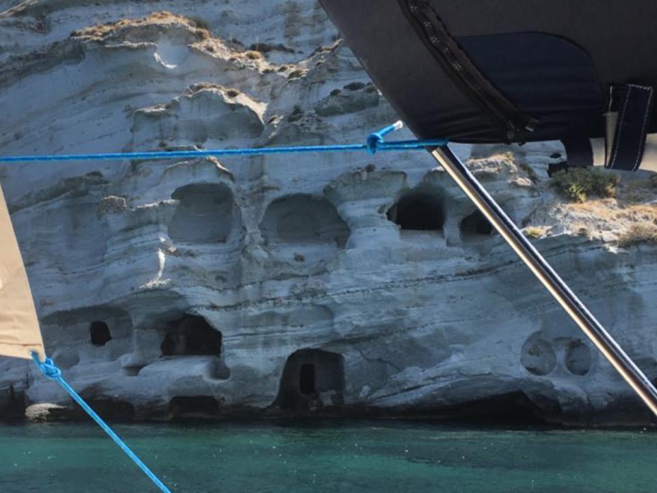 6. Tag – Milos – Bootstour Wir sind ja schon Rentners und wirklich „viel“ geflogen. Angesichts von 38 Grad Hitze und CAVOK beschließen wir einen „Schlechtwettertag“. Notgedrungen chartern wir ein 44 ft Segelboot. Bei mäßigem Seegang darf Borchert Käptn spielen. Schöne Zwischenstopps bei denen die Lagunen mit dem kleinen Beiboot erforscht werden, sorgen für ein wunderschönes Erlebnis auf dem Meer.