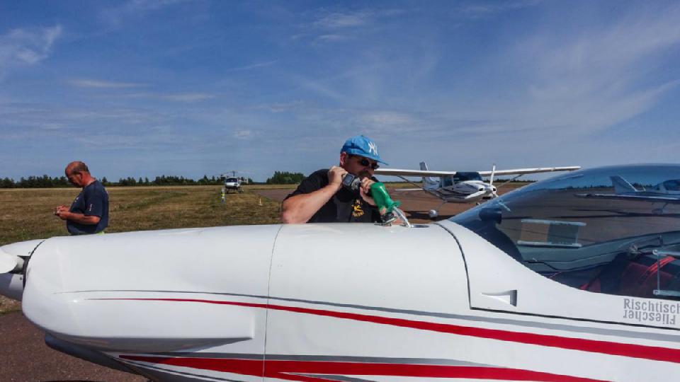 Landung auf der 09, breite saubere Asphaltpiste, die Formation rollt komplett durch. Das allerletzte Ende der Piste und die fürchterlichen Taxiways werden von Eisenbahnschienen durchschnitten. Während die TL zügig durchrollen fürchten die Fascination-Piloten um ihre Fahrwerke. Tanken, Fotoshooting für die Flieger, Flugplan nach Estland und Start auf der 09.